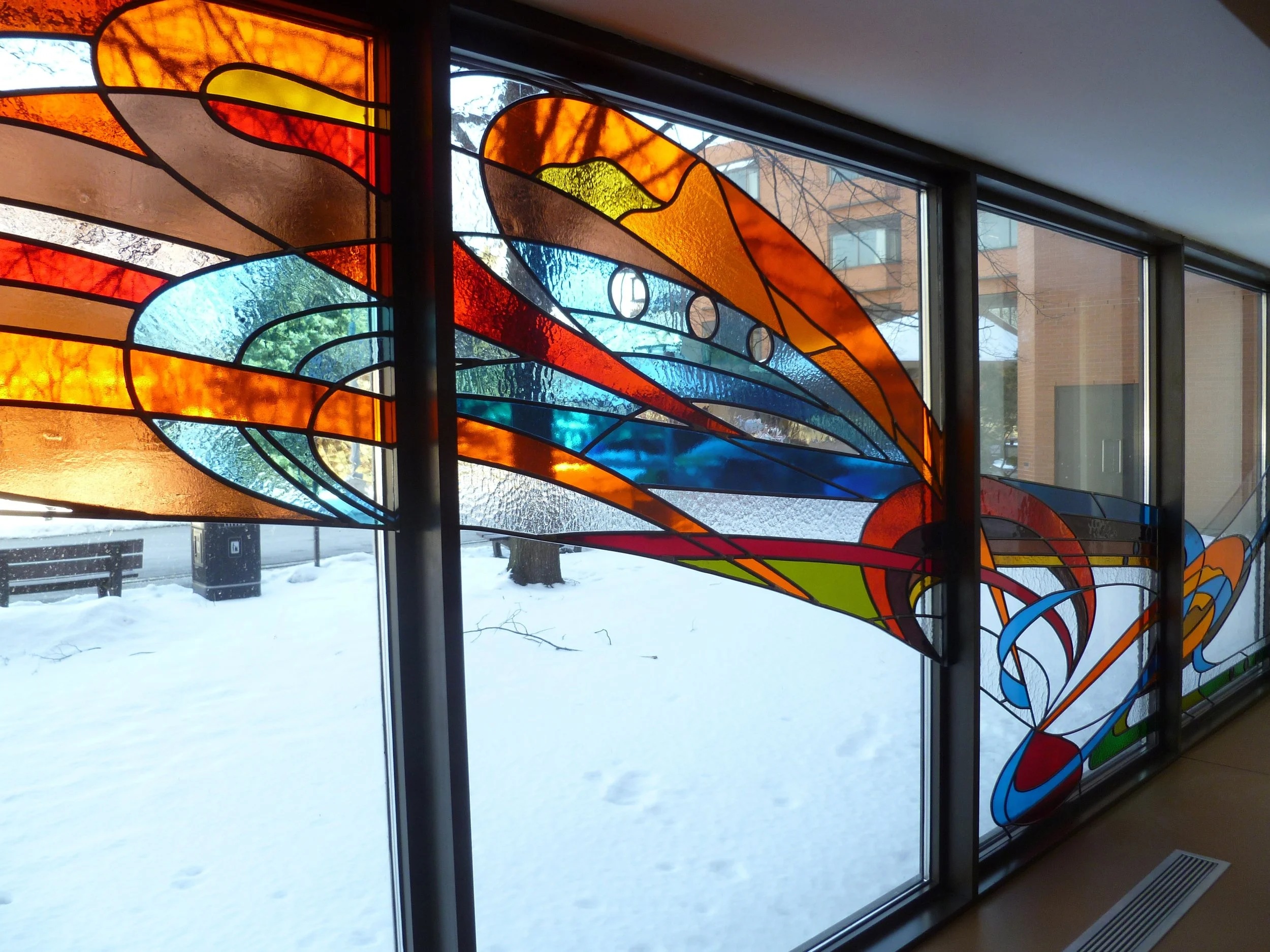 This window was created for Wally’s Place, a group home for people with special needs in Guelph. The building of the home was a community effort and, in thanks for their involvement, the idea of “community” was my starting point in designing the doorway. The design for the glass was done in collaboration with one of the residents at Wally’s Place. The piece evokes a sense of the globe through its’ rounded shape and constructed perspective, creating the illusion of a sphere in the flat space. The interior hallway light shines into the exterior entrance, creating a sense of welcome to viewers on either side of the door depending on the changing daily light. This welcoming quality is also emphasized through the vibrant and warm colours of the window, a feature that both reflects the aesthetic wishes of the residents and the cultural diversity of the community. The frame of the doorway was inspired by the art nouveau “Glassmaker’s House” in the Ixelles Pond district of Brussels (designed by Gruner Sterner, a Viennese stained glass craftsman).